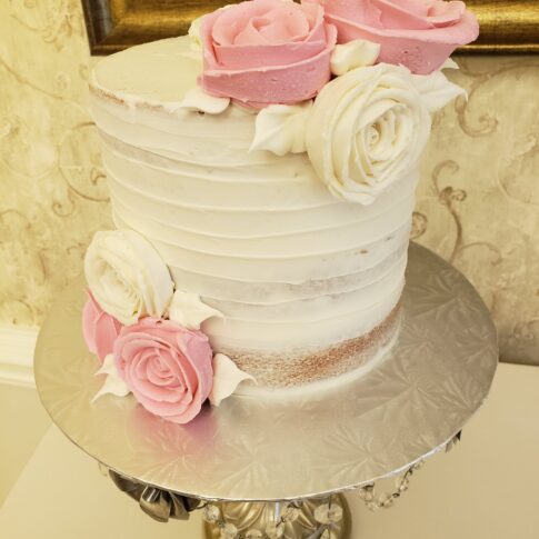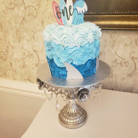 Let us help you bring your creation to life for any event! Generally, our cakes have three layers of cake with filling in between. The majority of our cakes are covered in our delicious vanilla buttercream. Most of our clients prefer a buttercream finish with the use of fondant embellishments. Email us with our event specifics so we can get started creating your delicious event centerpiece!
